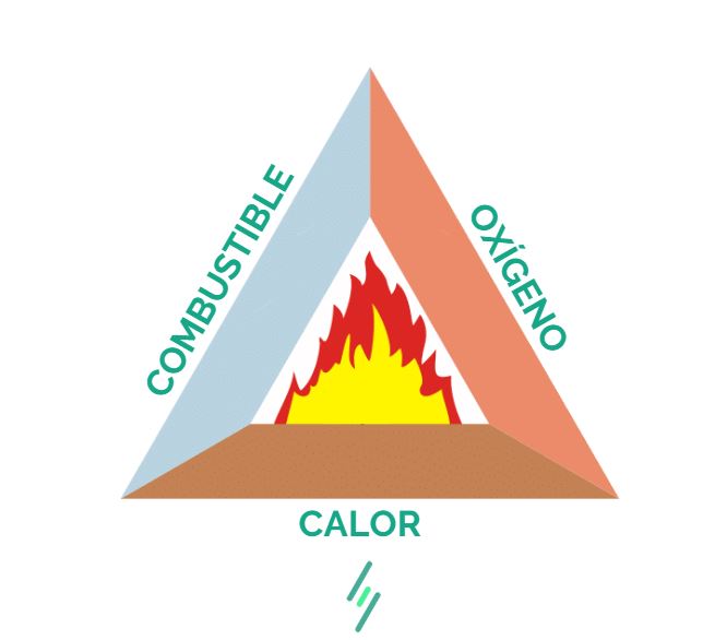 El triángulo del fuego representa los elementos necesarios para que se produzca la combustión. Es necesario que se encuentren presentes los tres lados del triángulo para que se genere el fenómeno que denominamos fuego.