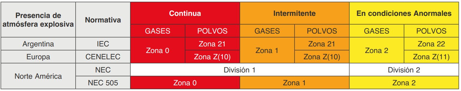En resumen, el código NEC clasifica las áreas según el tipo de combustible presente (gas, polvo o fibra) y según la permanencia del mismo en dicha área (en operación normal o accidental).