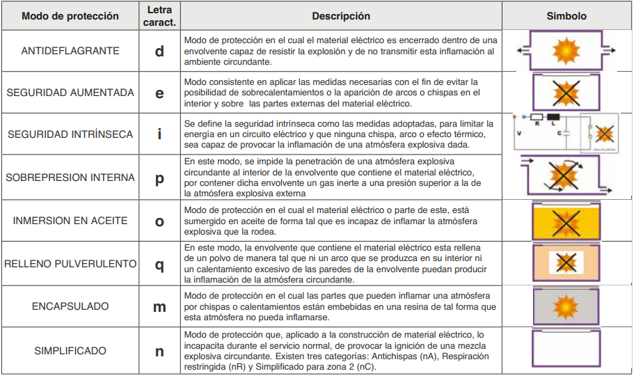 Dependiendo de la zona y el tipo de combustible, existen varios modos de protección, estos son los requisitos específicos aplicados al material eléctrico para evitar la ignición de una atmósfera explosiva que lo rodea.